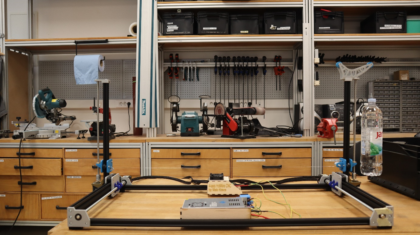 Projekt 4-osnega CNC-rezalnika je zrasel iz želje po hitrem in neodvisnem prototipiranju letal pri ekipi Edvard Rusjan Team. Ekipa vsako leto izdela dva prototipa in končno letalo, vsako pa je zahtevnejše za izdelavo in bolj optimizirano. Večina komponent rezalnika je 3D-tiskanih, zato je naprava prilagodljiva in poceni za izdelavo. Z delovno prostornino 1000 x 750 x 500 mm omogoča 3-krat več od konkurence za kar 15-krat nižjo ceno. Štiri samostojne osi omogočajo izdelavo puščičastih in trapeznih kril, problem spremenljive dolžine žice pa rešuje viseča utež, ki zagotavlja konstantno napetost. V načrtu je tudi nadgradnja projekta z lastno programsko kodo, ki bo nadomestila utež s koračnim motorjem.